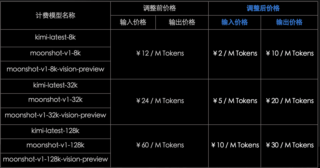 Kimi 开放平台的朋友们,基于 Moonshot AI 一年来的技术积累和性能优化,我们已经在北京时间 2025 年 04 月 07 日 0 点对 Kimi 开放平台提供的模型推理服务进行价格调整,具体调整方案如下: