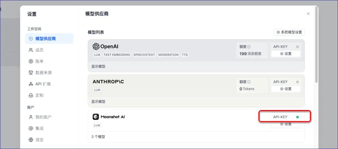 点击 “配置”,输入 Kimi 的 API Key,保存。此时在顶部的 “模型列表” 就可以看到 Moonshot AI 已经点亮: