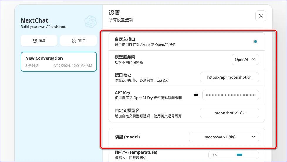 这里采用 NextChat 这个项目来讲解,因为它的配置项比较齐全,而且它还提供了一个在线演示网站 (opens in a new tab)。我们点左下角的配置按钮,把 Kimi API 配进去: