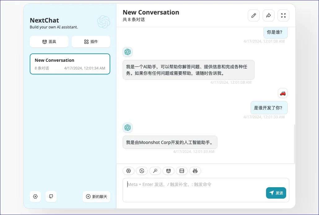 然后回到主界面,尝试和机器人对话。你会发现,NextChat 可以基于 Kimi API 完美运行!