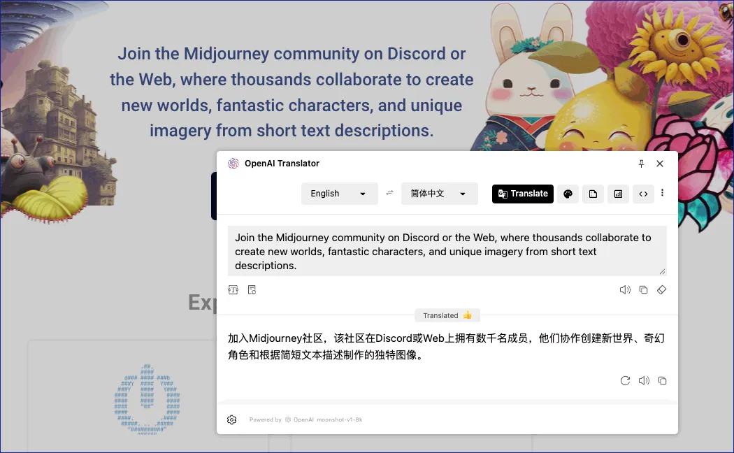 我们按照图中的配置,就可以启用 Kimi API 作为插件的翻译引擎了。保存配置,打开外文网页,选择任意一段文本,点击弹出的小花花图标,就可以看到插件的翻译结果了。
