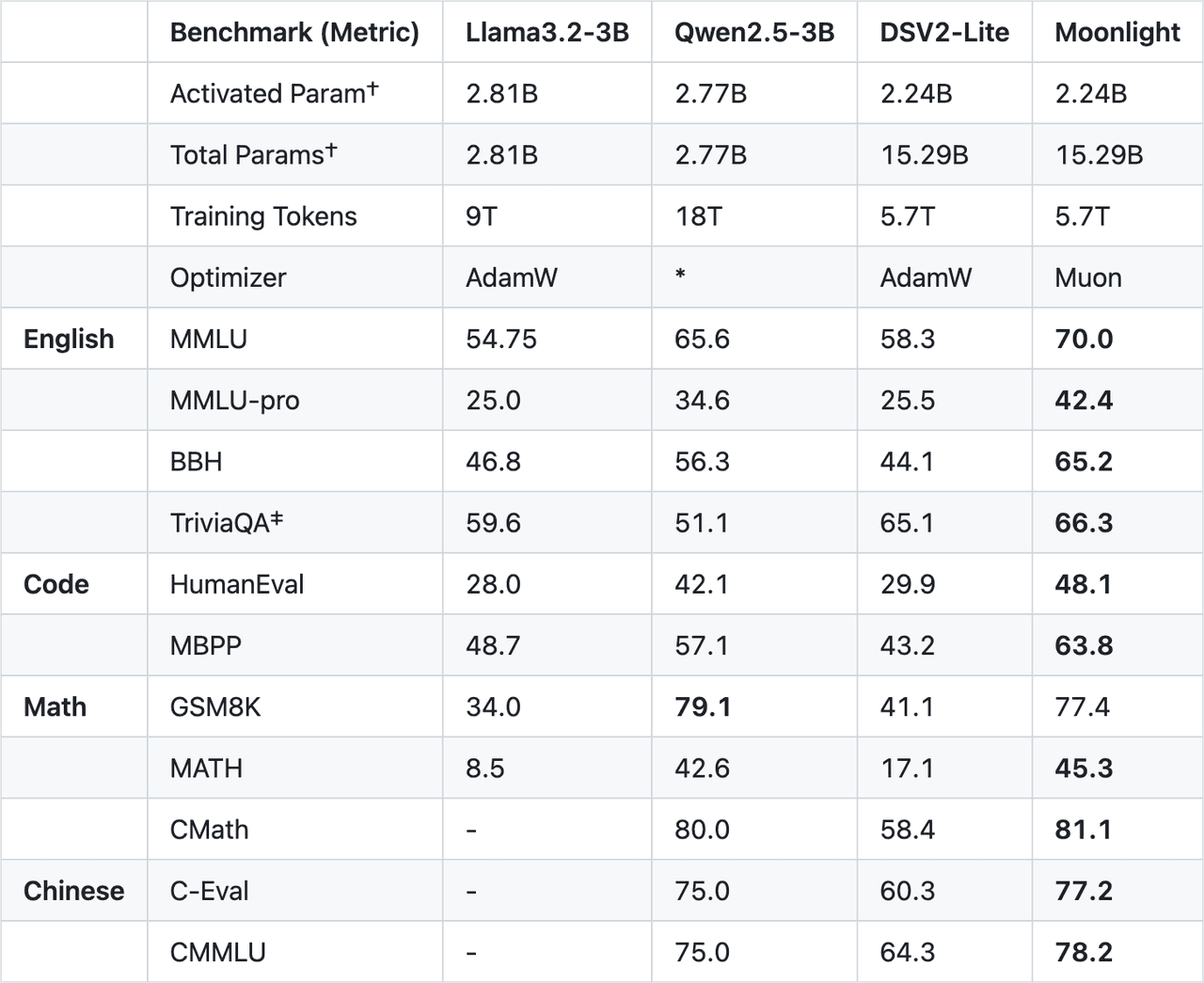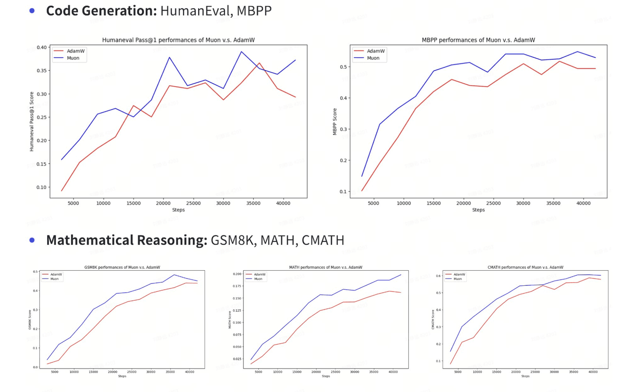 - 我们可以看到使用 Muon 训练的 Moonlight 模型在数学和编程方面的表现优于使用AdamW训练的Moonlight-A。