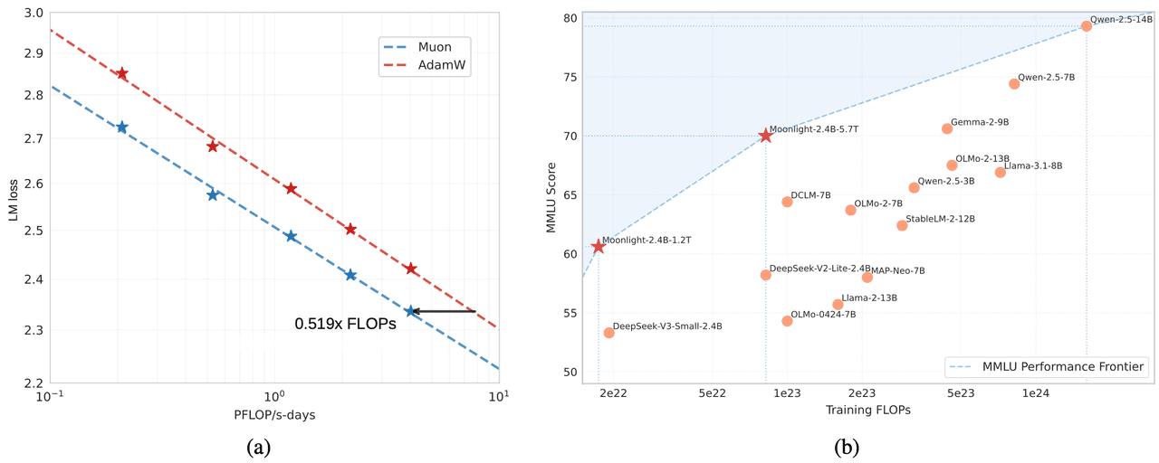 图注:Muon的扩展性验证。(a)比较Muon和Adam的扩展性实验表明,Muon的样本效率是Adam的2倍。(b)我们的Moonlight模型在MMLU上的表现与其他同类模型的对比。Moonlight在性能与训练计算量的权衡上推进了帕累托前沿。